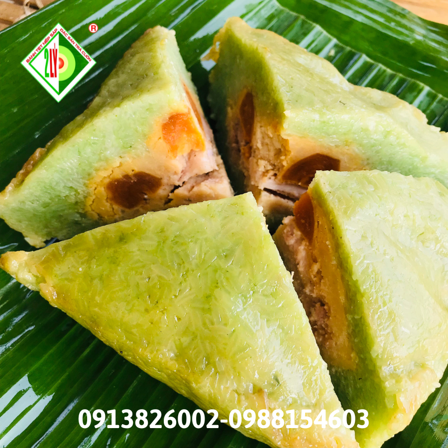 Bánh chưng trứng Thành phần: nếp sáp, đậu xanh, thịt mỡ, trứng muối, được gói bằng lá chuối