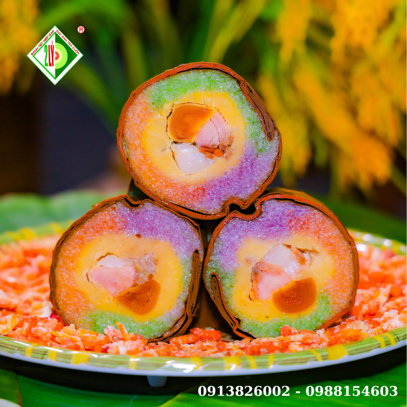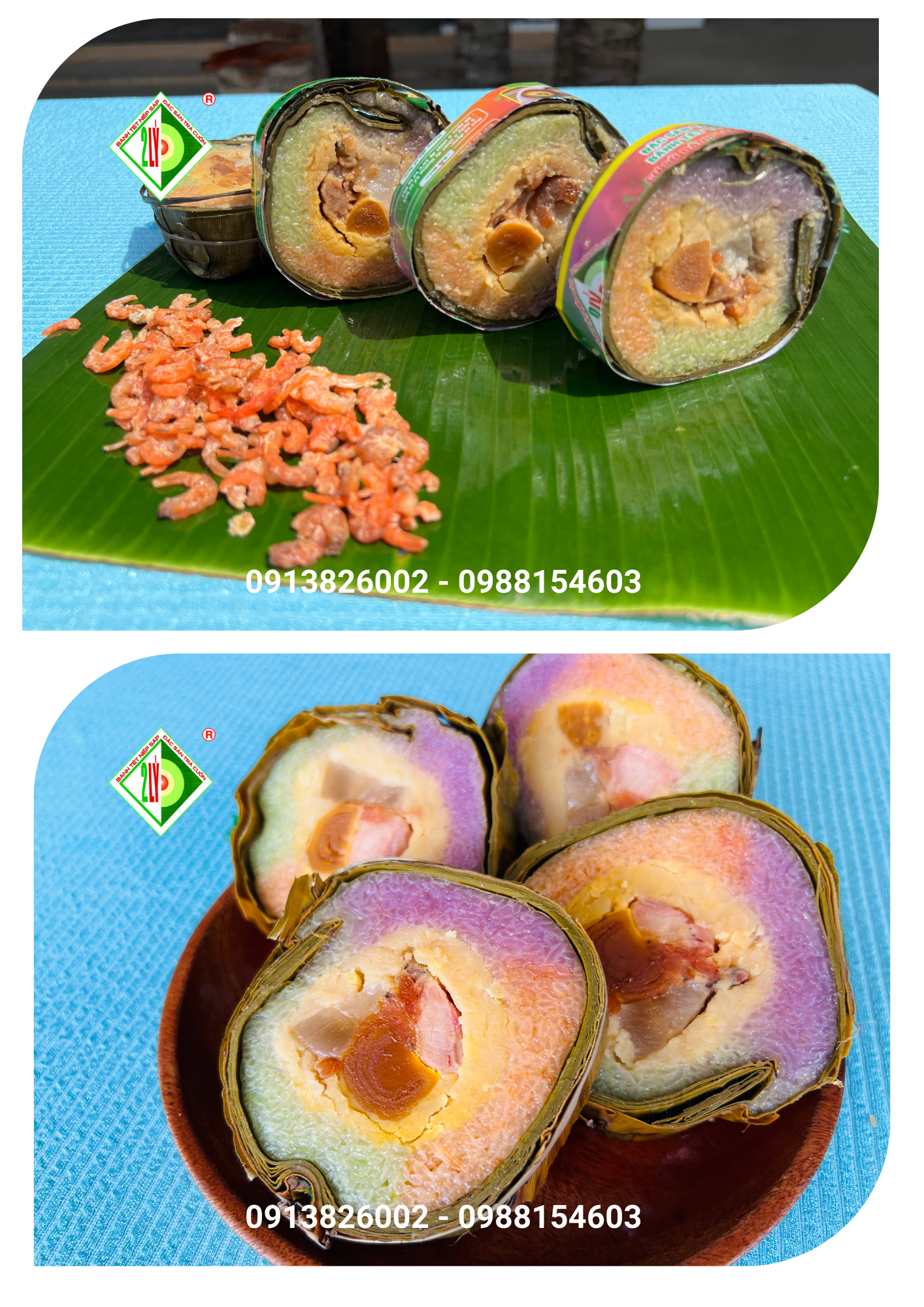 Bánh được làm từ các nguyên liệu cơ bản như nếp, đậu xanh, thịt- mỡ, trứng muối nhưng đa dạng hơn là có thêm tôm khô và về màu sắc. Phần nếp được trộn mang ba màu riêng biệt: cam, tím và xanh lá. Màu sắc đa dạng nhưng các màu không phải làm từ các chất tạo màu hoá học mà sử dụng nguyên liệu từ tự nhiên như gấc, lá cẩm, bồ ngót.